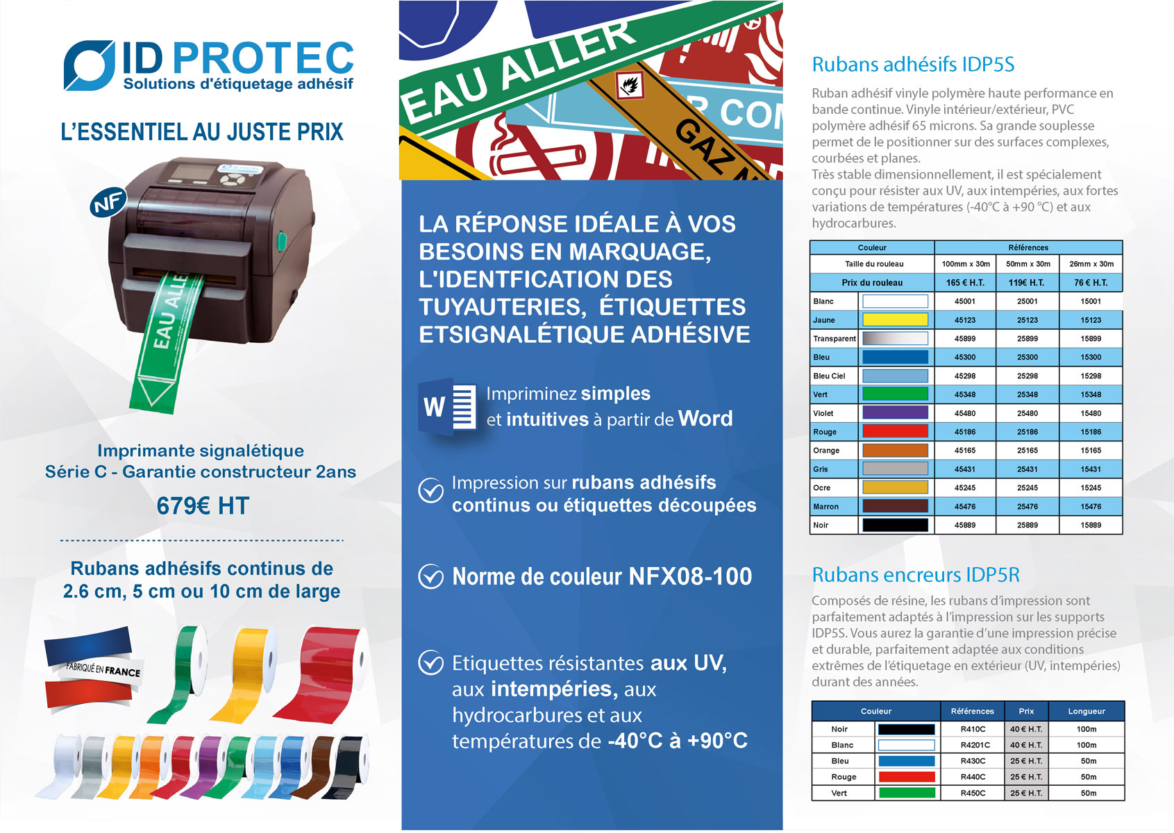 Garantie 2 ans, notre imprimante vous permet de réaliser à partir de WORD du marquage sur Rubans Adhésifs Techniques, des étiquettes techniques, et elle est parfaitement adaptée pour la réalisation vos marqueurs/étiquettes de tuyauterie en suivant la norme de couleur NFX08-100.