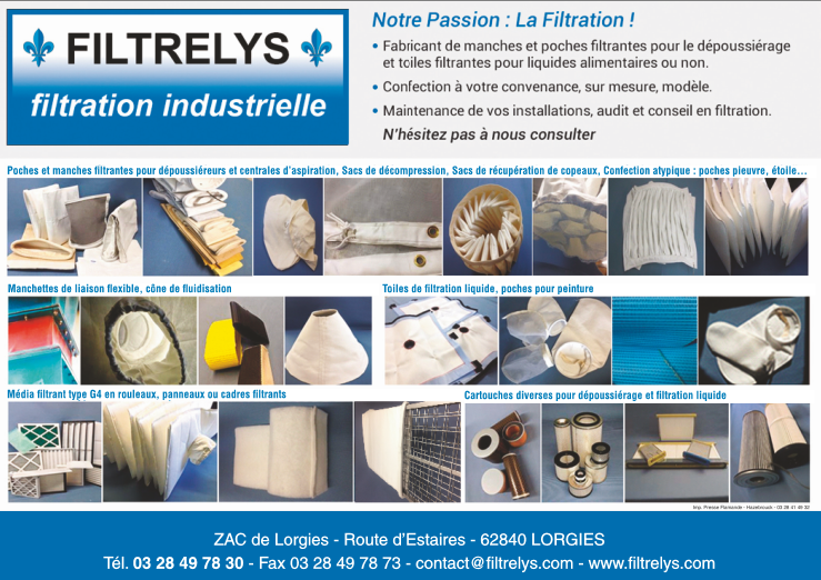 FABRICATION d'éléments filtrants : Manches, poches, multipoches, big-bag, manchettes (liaison, décompression, ...) , toiles, de filtre presse, médias filtrants (panneaux, cadres ...) , cartouches, paniers, ... et fourniture de tous les éléments pour votre dépoussiéreur, votre ventilation, ou votre unité de manutention/vrac. FILTRELYS vous apporte une large gamme de produits de qualité pour répondre à vos besoins en filtration sèche ou liquide. - Fabrication Française - Dimensionnement et conception Standard ou Sur-mesure - Fiabilité des délais de production - Engagement écologique et Protection de l'environnement - Analyse et recherche de solutions. Notre Flexibilité et Disponibilité sont au service de nombreuses entreprises industrielles, dans la chimie, la papeterie, le textile, la métallurgie, la cimenterie, ou encore le recyclage, et bien d'autres ... TOUTE L'EQUIPE est à votre disposition !