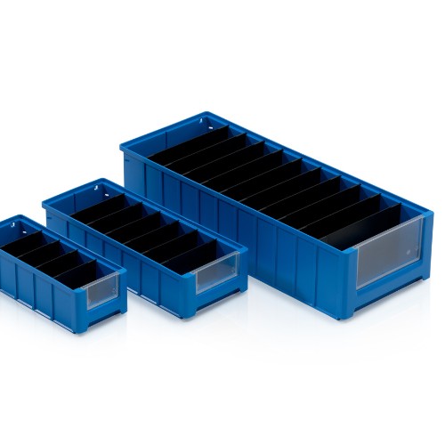 Idéal pour les petites pièces Parfaitement adapté aux rayonnages et aux carrousels de stockage Parfaitement empilable Possibilité de division interne par des cloisons Porte-étiquettes intégrés